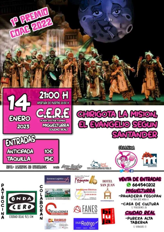 La Chirigota de Cádiz “La Misión, el Evangelio según Santander” se presentará en Miguelturra (Ciudad Real) el sábado 14 de enero de 2023 en el CERE de la localidad a las 21:00 horas. Un evento carnavalero que tal como ha informado el área de Festejos del ayuntamiento de la localidad, es organizado por la Peña «Los Cansaliebres» de Miguelturra. Y en el que colabora el Ayuntamiento de Miguelturra y varias casas comerciales; patrocina Onda Cero Radio.