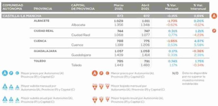 Con 1.058 euros por metro cuadrado en abril de 2021, Guadalajara fue la provincia más cara de la comunidad. Ciudad Real (747 €/m²) fue la provincia española más barata.