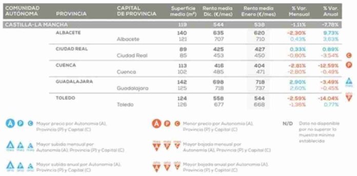 La mensualidad más barata por autonomía ha sido en Castilla-La Mancha. Así lo indica el informe mensual de precios de alquiler de pisos.com. El piso tipo de alquiler en Castilla-La Mancha registró en enero de 2021 una superficie media de 119 metros cuadrados y una renta media de 538 euros. El descenso mensual fue del -1,11%. Respecto a enero de 2020, el recorte fue del -7,78%, el tercero más pronunciado a nivel nacional.