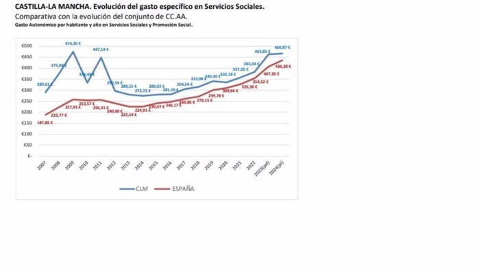 El informe ‘La inversión social por comunidades’, elaborado por la Asociación de Directoras y Gerentes de Servicios Sociales, indica que esta falta de inversión en Castilla-La Mancha repercute directamente en el gasto por habitante en servicios sociales, que ha disminuido en 10,45 euros, situándose en 463,85 euros. Esto contrasta con la media nacional, que destina el 7,6% de su presupuesto a estas políticas.
