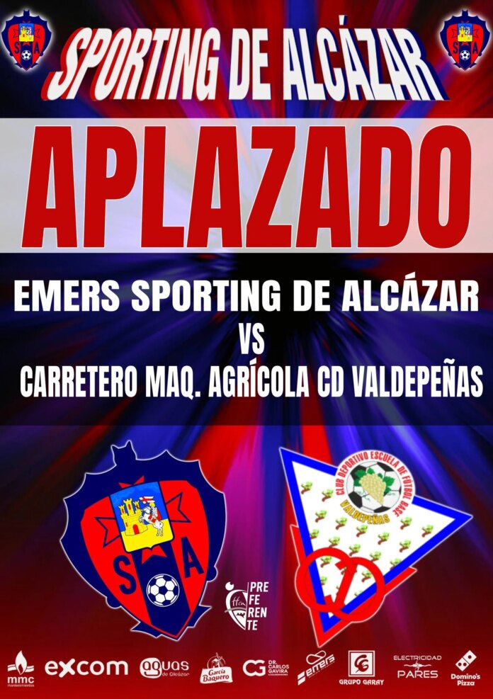 El Emers Sporting de Alcázar ha comunicado a sus aficionados y socios que el partido correspondiente a la jornada 13 de la Primera Preferente, programado para este domingo 30 de noviembre contra el Valdepeñas CF en el campo Delgado Meco, ha sido aplazado. Esta decisión ha sido tomada por el Comité de Competición de la Federación de Fútbol de Castilla-La Mancha.