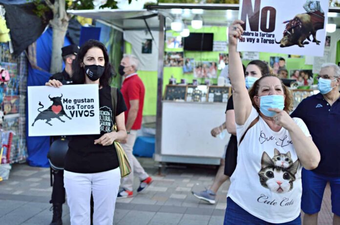 Algunos de los lemas que han gritado mientras salían los espectadores del coso son “aquí estamos, nosotras no matamos”, “sí a los toros, vivos y libres” o “Alcázar avanza, tu tradición espanta”.