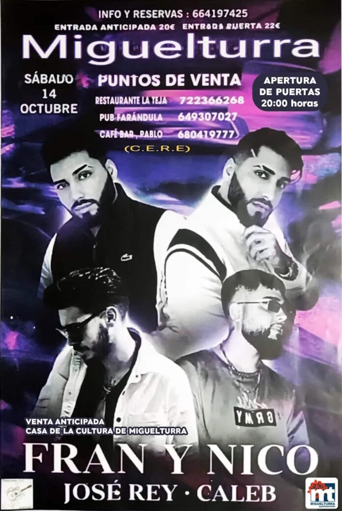 Un concierto de Fran y Nico, José Rey y Caleb tendrá lugar el sábado 14 de octubre a partir de las 8 de la tarde (apertura de puertas) en el Centro de Exposiciones y Representaciones Escénicas CERE de Miguelturra (Ciudad Real). Evento organizado por el área de Cultura.