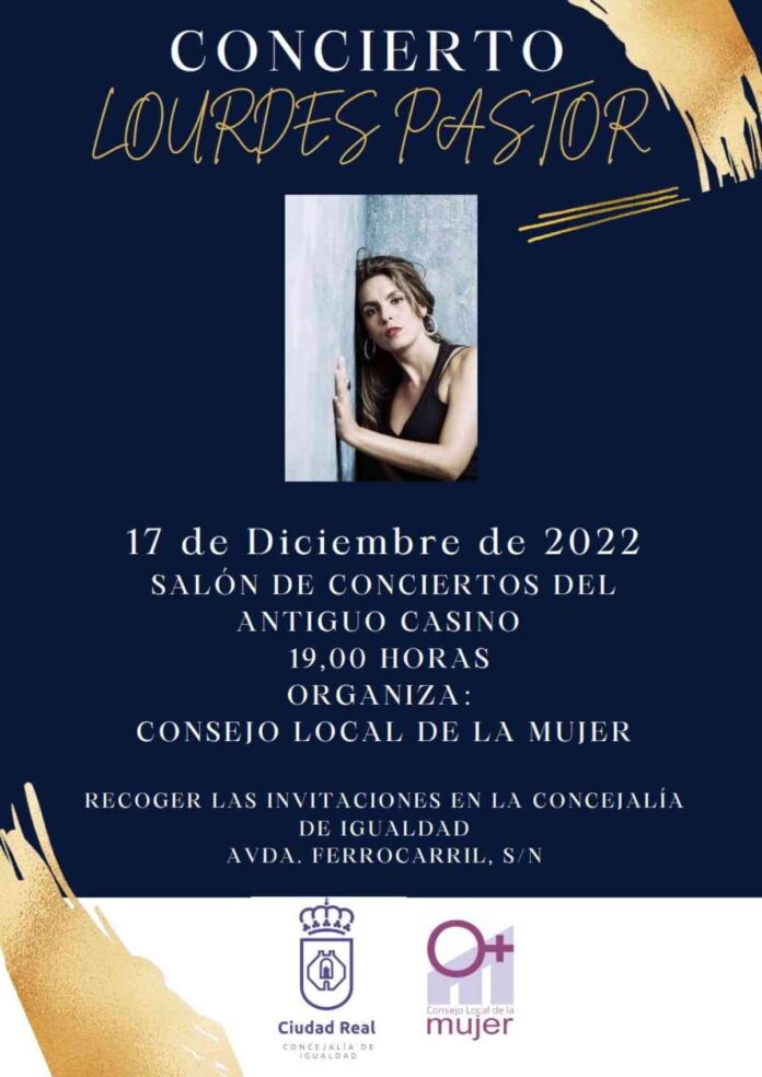 Un concierto de Lourdes Pastor se celebrará este sábado 17 de diciembre a las 19 horas en el Salón de conciertos del Antiguo Casino de Ciudad Real. Un evento que es organizado por el Consejo Local de la Mujer y la Concejalía de Igualdad del Ayuntamiento de Ciudad Real.