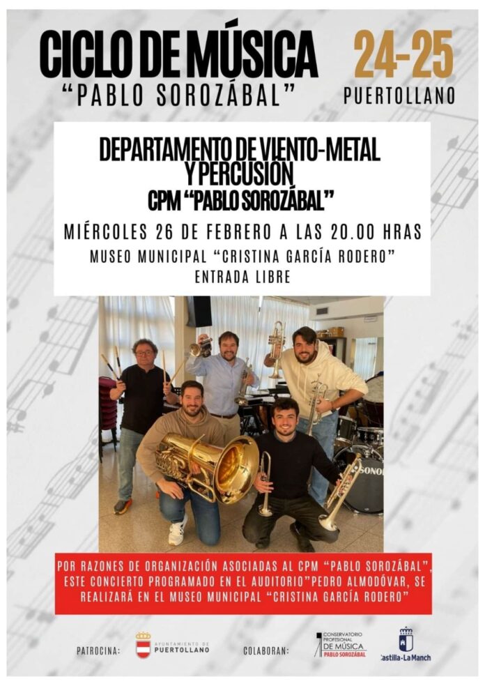 El Departamento de Viento Metal y Percusión del Conservatorio Profesional de Música “Pablo Sorozábal” invita al público a asistir a un concierto que se llevará a cabo el próximo 26 de febrero a las 20 horas en el Museo Municipal “Cristina García Rodero”. La entrada es libre y se enmarca dentro del Ciclo de Conciertos “Pablo Sorozábal” 24 – 25, el cual se está desarrollando durante este curso en Puertollano.