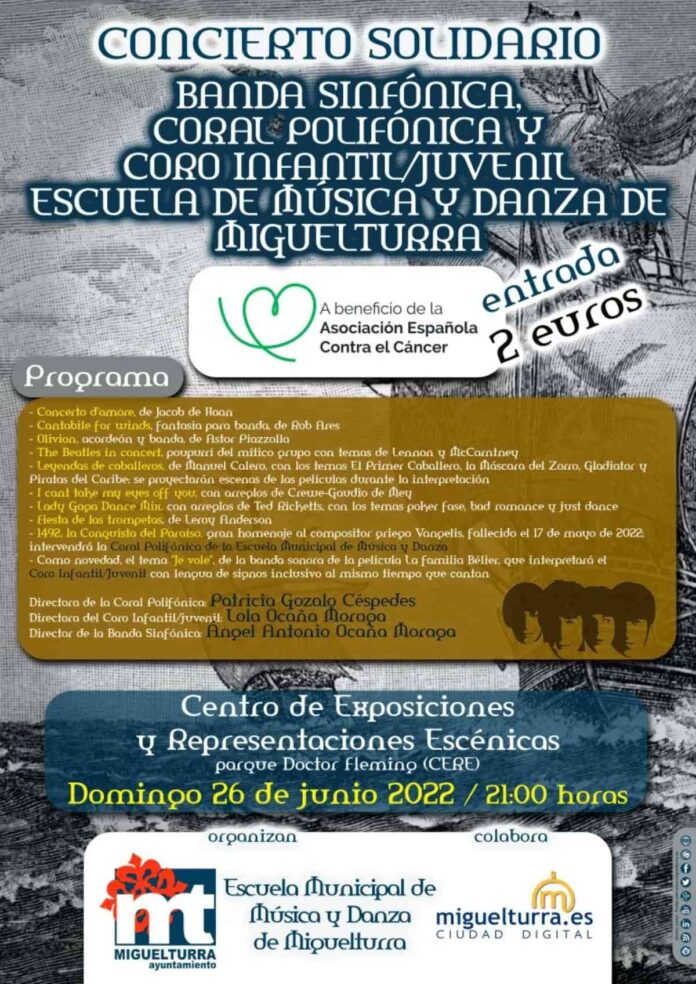 Un concierto solidario de la Banda Sinfónica, Coral Polifónica y Coro Infantil/Juvenil a beneficio de la Asociación Española contra el Cáncer tendrá lugar el domingo 26 de junio de 2022 a las 21 horas. Así lo ha informado, la Escuela Municipal de Música y Danza de Miguelturra (Ciudad Real), dependiente del área de Cultura. El evento será en el Centro de Exposiciones y Representaciones Escénicas (CERE).