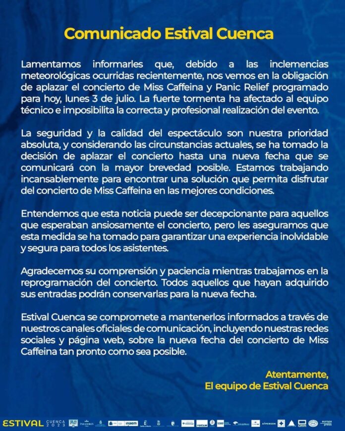 El festival Estival Cuenca ha anunciado que el concierto de Miss Caffeina y Panic Relief, que estaba programado para el pasado 3 de julio, ha sido pospuesto debido a los daños causados por una fuerte tormenta en el equipo técnico.