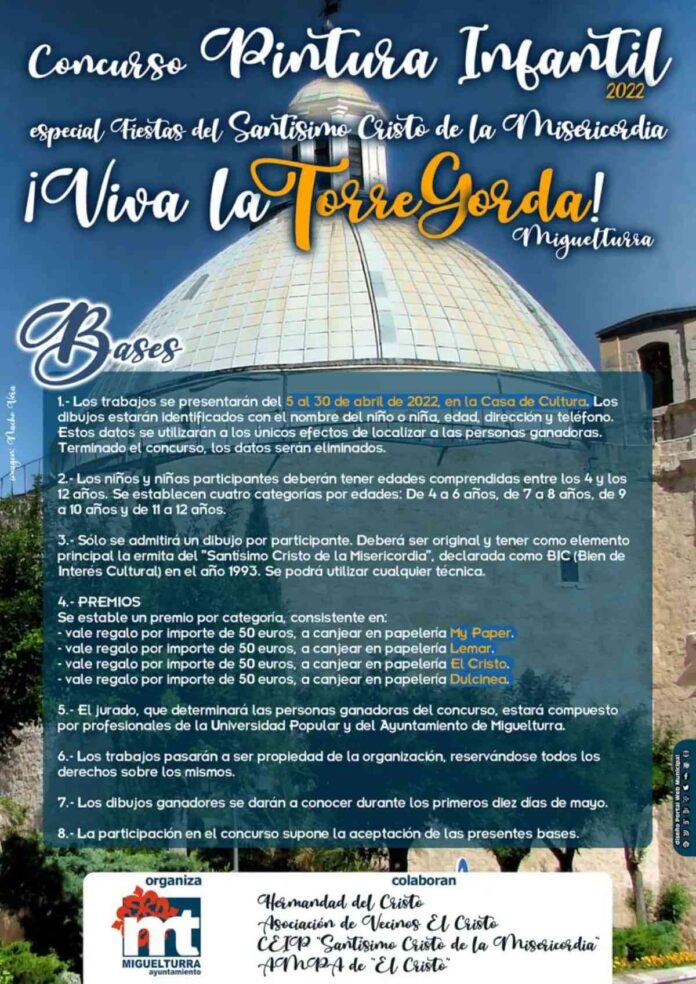 Por eso, el Ayuntamiento de Miguelturra, a través del área de Festejos, en promoción de nuestras tradiciones populares y con motivo de las Fiestas del Santísimo Cristo de la Misericordia, organiza de nuevo este concurso de dibujo infantil basándose en el lema «¡Viva la Torre Gorda!», en colaboración con la Hermandad del Cristo, la Asociación de Vecinos El Cristo, el CEIP «Santísimo Cristo de la Misericordia» y el AMPA «El Cristo».