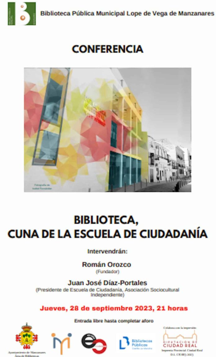 El 28 de septiembre se realizará la conferencia “Biblioteca, cuna de la escuela de la ciudadanía” en la Biblioteca Municipal Lope de Vega de Manzanares (Ciudad Real) a partir de las 21 horas.