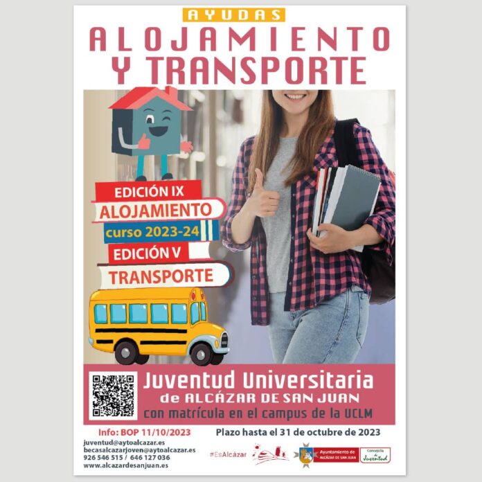 Alcázar de San Juan pone en marcha a través de la Concejalía de Juventud 14 becas de alojamiento y 14 becas de transporte para jóvenes empadronados en Alcázar de San Juan que por sus estudios universitarios de grado en el campus de la UCLM tengan que desplazarse y/o residir fuera de la localidad durante el curso universitario 2023/2024.