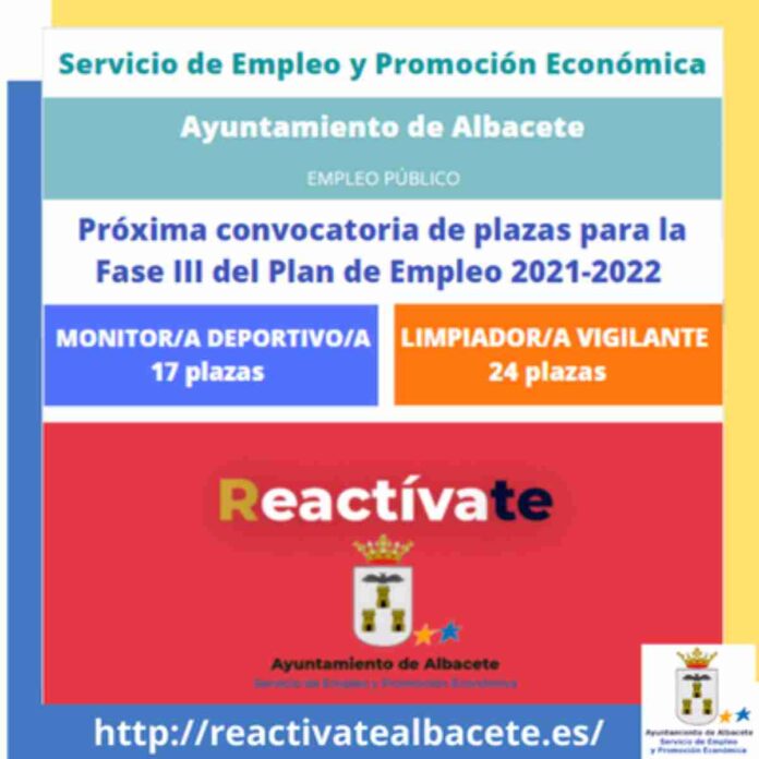 Una próxima convocatoria de plazas para la Fase III del Plan de Empleo 2021-2022 ha informado el ayuntamiento de Albacete. Al respecto, se trata de 17 plazas de monitor/a deportivo/a y 24 de limpiador/a vigilante. Para contratación durante tres meses a partir de junio.