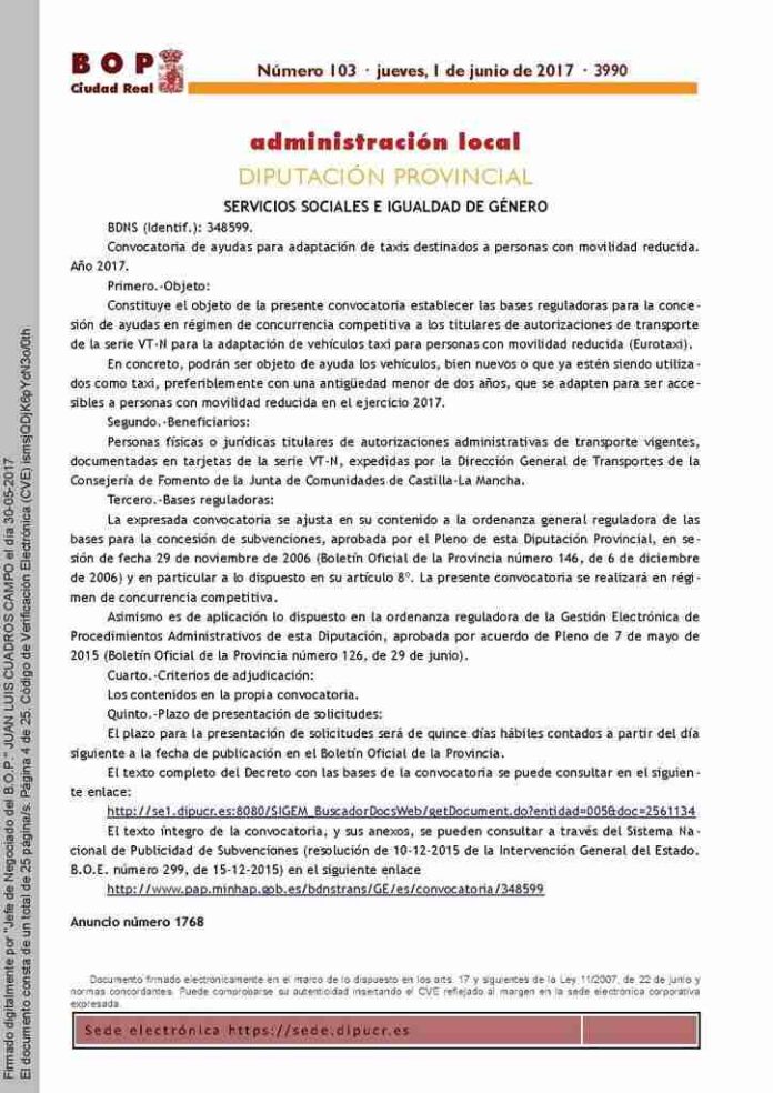 Con la publicación en el Boletín Oficial de la Provincia de este jueves, se hace firme la noticia que adelantamos hace unos días en la que mostramos la intención de la Diputación de Ciudad Real, de lanzar para este 2017, una nueva convocatoria a través de la cual favorecer la adaptación de taxis para mejorar el acceso de personas con movilidad reducida al transporte público.
