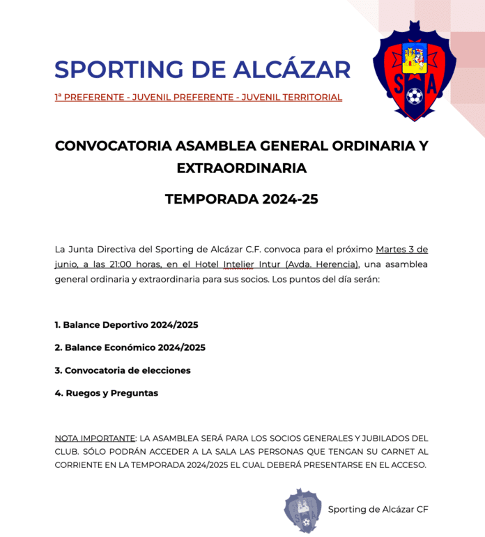 El Sporting de Alcázar C.F. convoca a sus abonados a una asamblea general ordinaria y extraordinaria el próximo martes 3 de junio de 2025, a las 21:00 horas, en el Hotel Intelier Intur, ubicado en la Avenida de los Deportes de Alcázar de San Juan. El objetivo de esta cita es realizar un balance deportivo y económico correspondiente a la temporada 2024/25 y convocar elecciones para la nueva junta directiva, dado que la actual culmina su mandato de cuatro años.