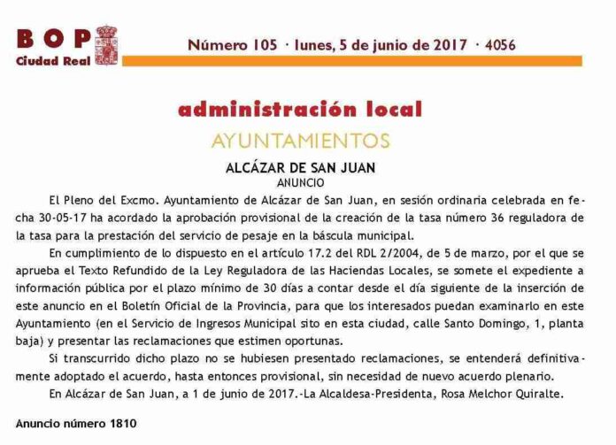 El Pleno del Excmo. Ayuntamiento de Alcázar de San Juan, en sesión ordinaria celebrada en fecha 30-05-17 ha acordado la aprobación provisional de la creación de la tasa número 36 reguladora de la tasa para la prestación del servicio de pesaje en la báscula municipal.