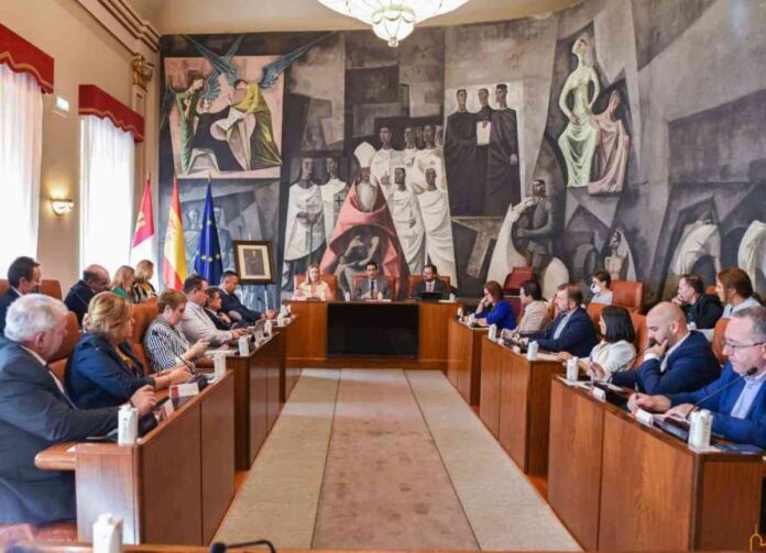 Se ha procedido, asimismo, a la aprobación de una modificación de créditos que, además de otras acciones, el destino de fondos de la Diputación a la rehabilitación y recuperación del Salón de Recepciones del Palacio Provincial, la estancia que sufrió el desprendimiento de parte del techo en el que fue acoplado el lienzo en el que Andrade representó a don Quijote y Clavileño. En la pasada Semana Santa resultaron afectados, asimismo, los flancos en los que se representan los escudos de los partidos judiciales que había entonces en la provincia.
