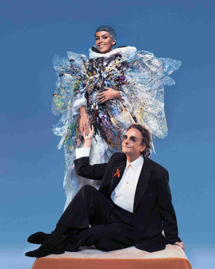 Buj Studio se ha encargado de realizar la capa alada, una pieza que cuenta con más de 580h de trabajo entre diseño y confección, y Manuel Albarrán, encargado de realizar los complementos del estilismo (casco, uñas y zapatos). El resultado es un diálogo sobre la metamorfosis y el proceso misterioso de transformación que llevan a cabo muchos insectos y otros seres vivos que buscan al cambiar de piel un nuevo renacer.