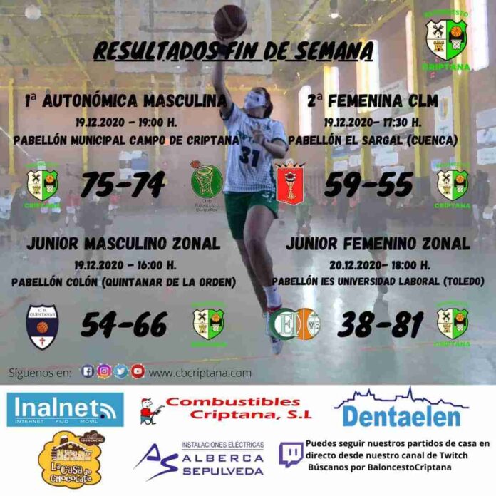 Baloncesto Criptana 66 (7,23,22,14)) Juanma Vela (6), Adrián Cipar (2), Miguel Abellán (19), Angelma Violero (24), Juan Abad (8), Pedro Masa (-), Fernando Violero (-), Fran Lizcano (6), Esteban Moratallla (-), Carlos Olivares (-), Rodrigo de la Guía (-) ,Enrique Vidal (1).