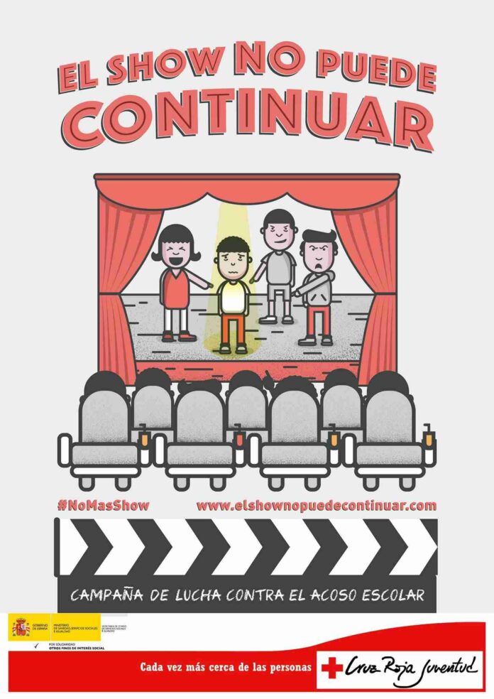 «El show no puede continuar« es el lema de la campaña que Cruz Roja Juventud lanza este año, para luchar contra el acoso escolar. Poniendo el foco en las personas que observan el conflicto, y por ende son parte del mismo y también pueden hacer algo. A través de diferentes situaciones, acercamos a la realidad de las redes sociales, diferentes situaciones y conflictos que se dan en acoso escolar.