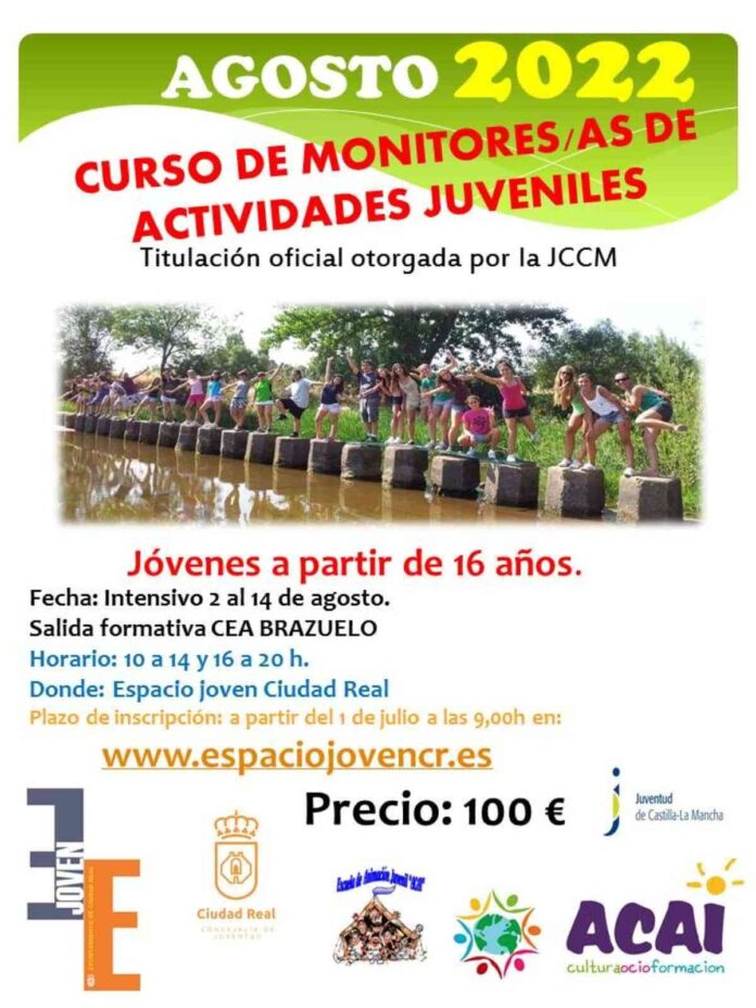 Del 2 al 14 de agosto se llevará a cabo un Curso de Monitor y Monitora de Actividades Juveniles del Espacio Joven de Ciudad Real. El mismo con titulación oficial otorgada por la Junta de Comunidades de Castilla-La Mancha a través de la Escuela de Animación: ACAI.