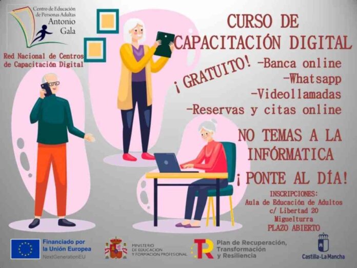 Un curso gratuito “Curso de capacitación digital” que es de iniciación a la informática para personas sin conocimientos informáticos se impartirá a partir del 27 de abril. Así lo ha informado el área de Educación informa que el Centro de Educación de Personas Adultas Antonio Gala de Miguelturra (Ciudad Real). El curso es financiado con fondos europeos.