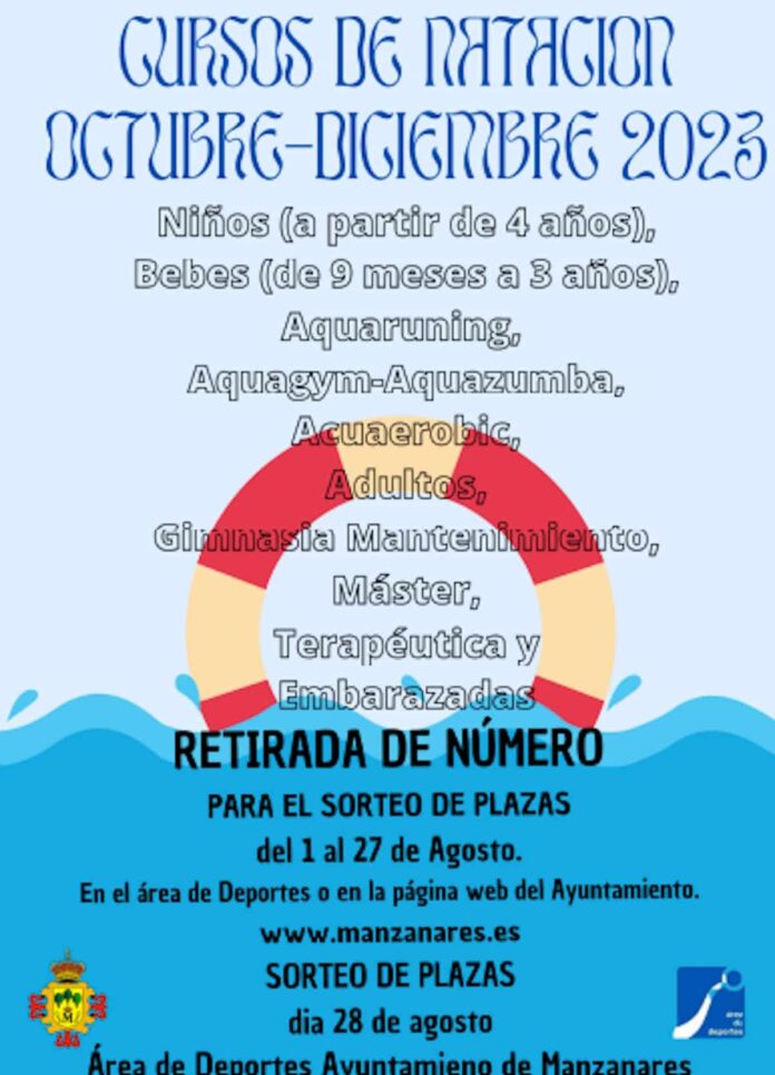 Cursos de natación se ofrecerán en Manzanares (Ciudad Real) de octubre a diciembre de 2023. Así lo ha informado el ayuntamiento de la localidad. Para niños a partir de 4 años, bebes de 9 meses a 3 años. También Aquarunning, Aquagym, Aquazumba, Acuarebic, Adultos, gimnasia mantenimiento, máster, terapéutica, y embarazadas.