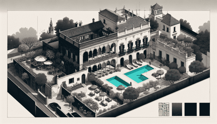 La casa también ha incorporado una moderna piscina que conecta directamente con la zona de estar principal. Este nuevo espacio, más que un lujo estético, se ha concebido como un recurso para mitigar las altas temperaturas estivales de Sevilla. Los azulejos que recubren la piscina reflejan la luz del sol, creando un ambiente refrescante y un atractivo visual excepcional.