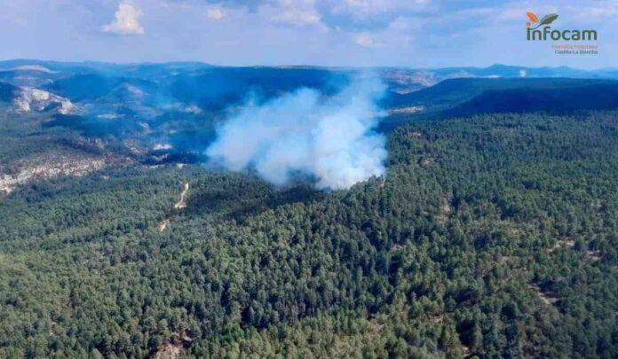 El fuego era detectado por un vigilante fijo a las 15.58 horas de este lunes y la superficie afectada es forestal arbolada, con un 60 por ciento ocupada por pino salgareño y un 40 por ciento por pino silvestre.