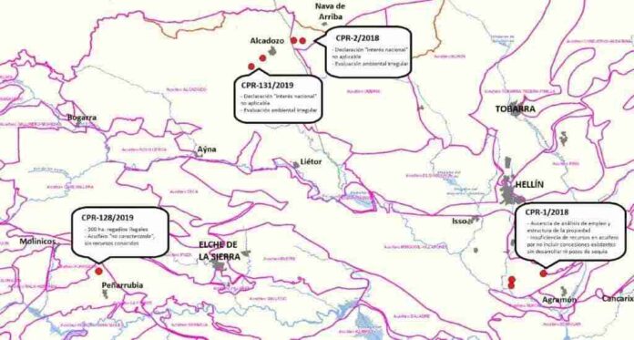 Desde la Plataforma también señalan que los expedientes de Alcadozo y Nava de Arriba (Pozohondo), también podrían afectar a las fuentes de Ayna y Liétor, y para su aprobación se utilizó una declaración de interés nacional “totalmente desfasada” ya que data de 2003, y bajo el paraguas genérico del término “otros” –en referencia a otros términos municipales, distintos de los que se citan explícitamente en la declaración-. Se sabe, por el Plan Hidrológico de 1998, que en todo caso era de aplicación únicamente a la cuenca vertiente de los embalses del Talave y del Cenajo, y sin embargo –desde la Consejería de Agricultura y la CHS –pretenden aplicar la declaración de interés nacional fuera de este ámbito territorial, en un clarísimo caso de fraude de ley”.