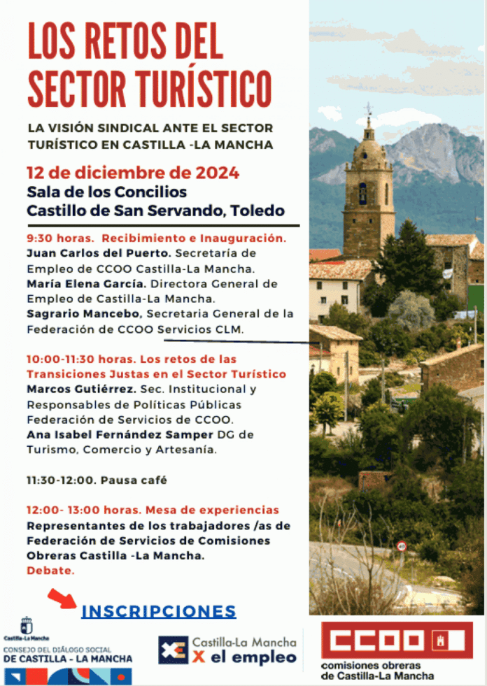 El jueves 12 de diciembre, Castilla-La Mancha acogerá una jornada sectorial organizada en conjunto por la Secretaría regional de Empleo y Políticas Públicas y la Federación de Servicios de CCOO CLM. Bajo el título «La visión sindical del sector turístico en Castilla-La Mancha», el evento tiene como objetivo analizar la situación actual de la industria turística en la región desde una perspectiva sindical.