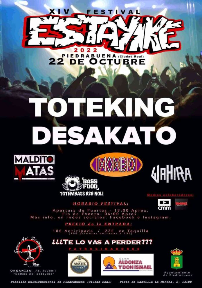 La música de Desakato y Toteking sonará el 22 de octubre en el pabellón multifuncional de Piedrabuena, dentro del festival de música alternativa ‘Estayike’, uno de los más antiguos de la provincia de Ciudad Real, llega con «muchas ganas» de retomar su actividad en la decimocuarta edición.