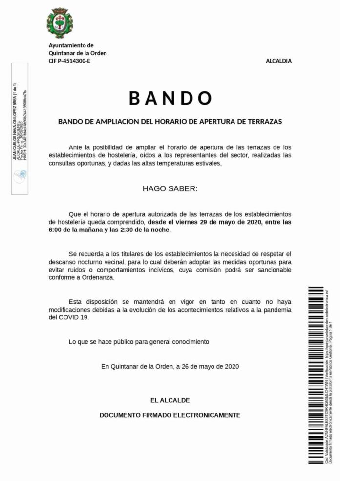 A partir del viernes 29 de mayo se amplía el horario de apertura de las terrazas de los establecimientos hosteleros de Quintanar de la Orden. Así se da a conocer a través de un Bando Municipal que fue publicado con fecha del 26 de mayo de 2020.