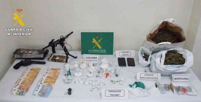 Dos vecinos de Almansa han sido detenidos por efectivos de la Guardia Civil del Puesto Principal de la localidad como presuntos autores de tráfico de drogas y tenencia ilícita de armas en el marco de la operación ‘Pifurri’. La intervención ha permitido la incautación de 717 gramos de cocaína, 1.500 gramos de marihuana y 65 dosis de éxtasis, suficientes para unas 11.700 dosis.