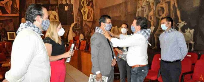 Caballero ha recibido de manos de la alcaldesa de Ciudad Real un plato de cerámica conmemorativo de la Pandorga 2021. Y el Cantero le ha impuesto el tradicional pañuelo de «yerbas» en el salón de Plenos de la Diputación provincial.