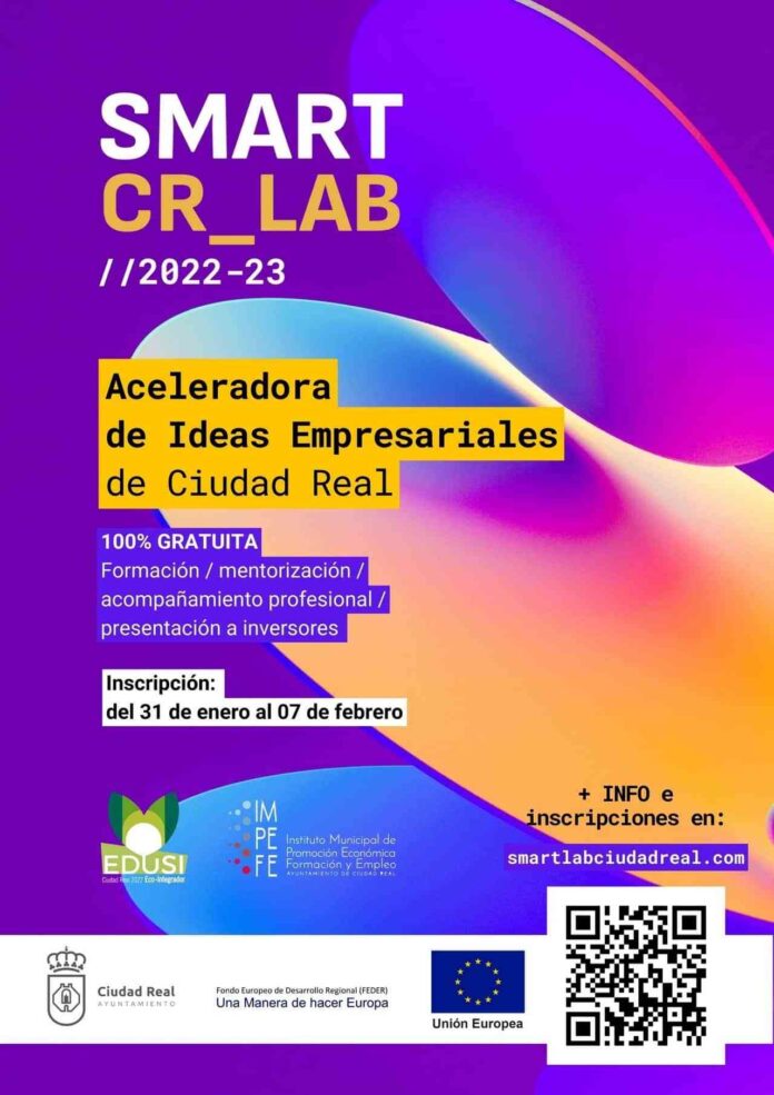 El Ayuntamiento de Ciudad Real, en cumplimiento de las acciones de la Estrategia de Desarrollo Urbano Sostenible Integrado, ha presentado el nuevo proyecto de aceleradora de ideas empresariales Smart CR – LAB que acogerá a 10 proyectos, ideas de negocio o empresas que necesiten una transformación, para que, a través de la formación, mentorización y la presentación a inversores, iniciar su andadura en el mundo empresarial de forma viable y exitosa. Todas estas acciones están cofinanciadas en un 80% por el Fondo Europeo de Desarrollo Regional (FEDER), a través del Programa Operativo Plurirregional de España 2014-2020