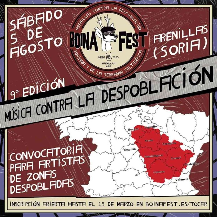 Desde hoy y hasta el próximo 19 de marzo, se encuentra abierto el plazo de inscripción en boinafest.es/tocar. Podrán apuntarse todos aquellos artistas residentes o con orígenes en los municipios situados en la Serranía Celtibérica. Dicho territorio recorre zonas de Soria, Teruel, Guadalajara, Cuenca, Segovia, Burgos, La Rioja, Castellón, Valencia y Zaragoza, y, aún duplicando el tamaño de Bélgica, en él, apenas viven menos de 500.000 habitantes y su densidad de población menor a los 8 habitantes por kilómetro cuadrado.