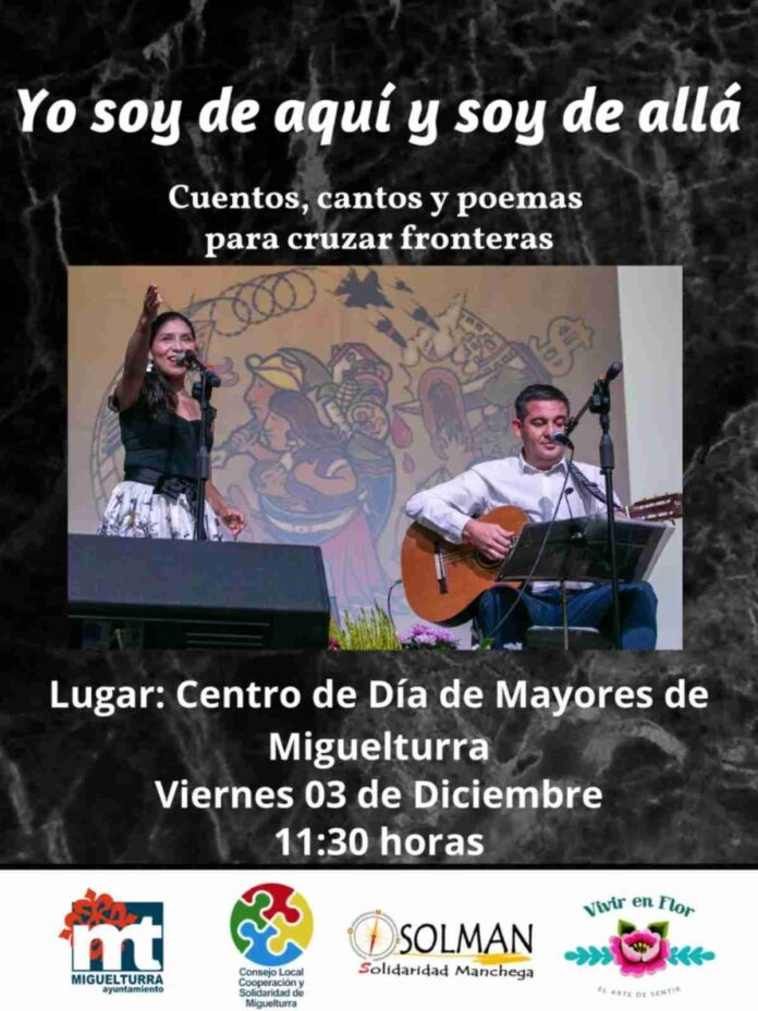 El viernes 3 de diciembre se desarrollará “Yo soy de aquí y soy de allá” una actuación poética musical compuesta por cuentos, campos y poemas para cruzar fronteras. Esta actuación forma parte de los actos para conmemorar el 25 aniversario del Consejo Local de Cooperación y Solidaridad de Miguelturra (Ciudad Real).