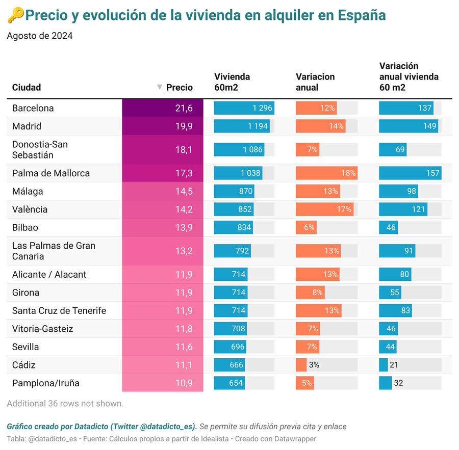 En el caso de Palma de Mallorca, la situación es aún más crítica, ya que el alquiler ha aumentado un 18% en el último año, situando el coste medio en 1.038€. Valencia también ha sufrido un notable incremento, con un aumento del 17%, lo que significa que la renta media para un piso similar se sitúa en 852€. Estas cifras no solo resaltan la presión sobre el mercado de alquiler, sino que también reflejan las dificultades que enfrentan los inquilinos en el acceso a la vivienda.