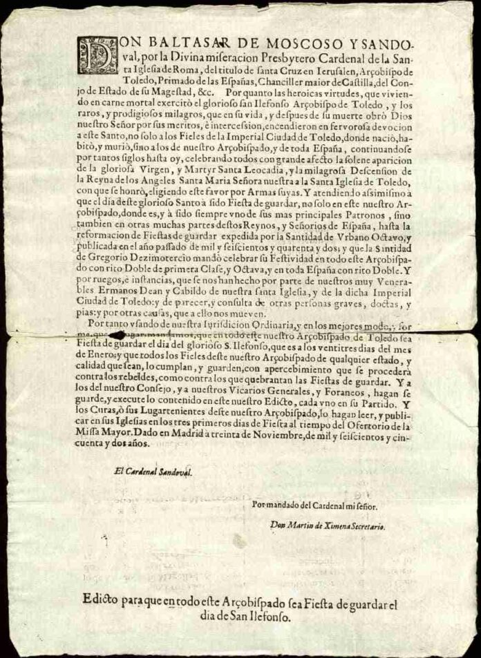 El edicto se hizo llegar a los toledanos en forma de bando el 24 de diciembre de 1652. En aquel pregón, como explica el archivero municipal, Mariano García Ruipérez, se hizo saber a “todos los vecinos y moradores de esta ciudad y villas y lugares de su arzobispado” que “se guarde por día de fiesta de aquí adelante el día del glorioso San Ildefonso, arzobispo de Toledo y natural de ella, que se celebra a 23 de enero de cada año”.