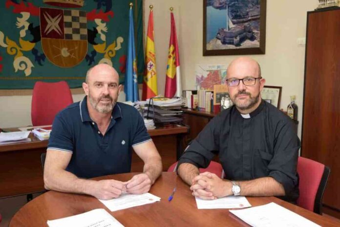 El alcalde, Pedro Ángel Jiménez, en representación del Ayuntamiento de Argamasilla de Alba (Ciudad Real), y el párroco local, Ángel Moreno, por la Parroquia de San Juan Bautista, han rubricado un convenio de colaboración a través del cual el consistorio contribuye con una subvención de 20.000 euros al pago de la reforma exterior de las entradas norte y sur de la iglesia San Juan Bautista.