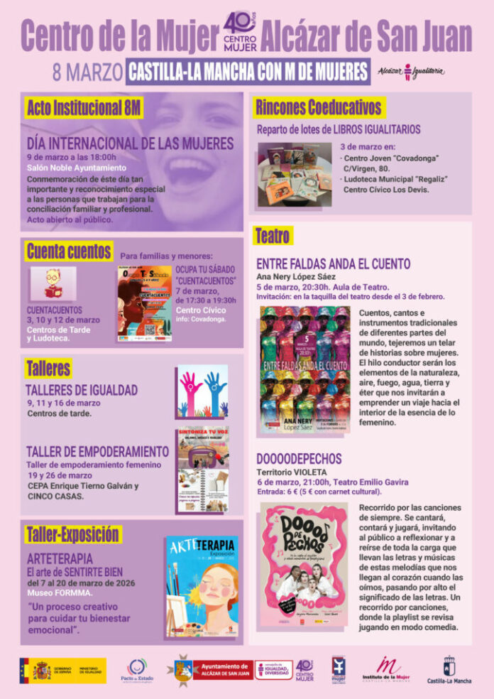 La programación comenzará con un acto institucional el 9 de marzo en el Salón Noble del Ayuntamiento, a las 18:00 horas. Este evento será uno de los ejes centrales para celebrar y reivindicar los derechos y logros de las mujeres en Alcázar de San Juan.