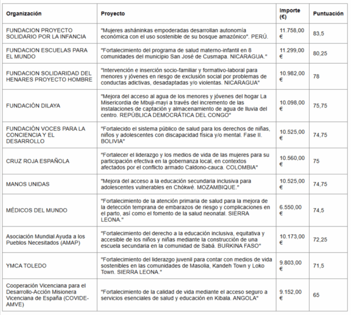 Por otro lado, se rechazaron las propuestas de la Asociación de Amigos del Pueblo Saharaui de Toledo, Asamblea de Cooperación por la Paz (ACPP), España con ACNUR y Humanitarios sin Fronteras al no alcanzar las puntuaciones mínimas requeridas.