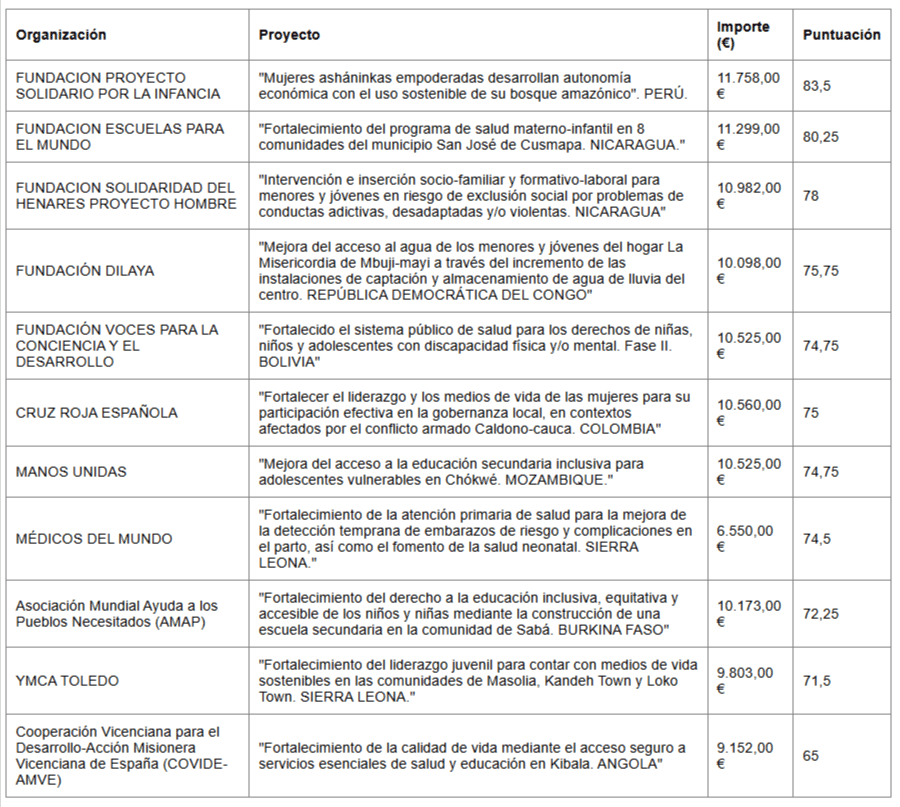 Las iniciativas subvencionadas abarcan una amplia variedad de sectores y están ubicadas en países como Perú, Nicaragua, República Democrática del Congo, Bolivia, Colombia, Mozambique, Sierra Leona, Burkina Faso y Angola. La Fundación Proyecto Solidario por la Infancia se destacó en la evaluación al recibir 11.758 euros para su proyecto en Perú, logrando 83,50 puntos en el proceso de selección.