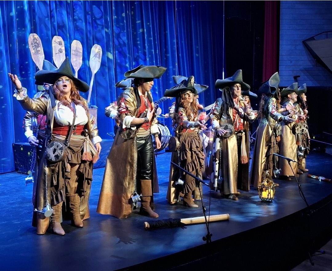 La velada comenzó con la comparsa de piratas «La reina del mar» de «Una comparsa con Áje», que sorprendió a los asistentes con la emotiva voz de su mascarona 2026, Andrea Portero, cuyo canto desbordaba sentimiento y pasión. La energía continuó con la actuación de «Contra viento y marea» de la Comparsa «La Victoria», quienes con su estilo refinado y su reciente victoria del Alfiler de Oro en el Concurso de Agrupaciones de Carnaval de Jaén, lograron cautivar al público.
