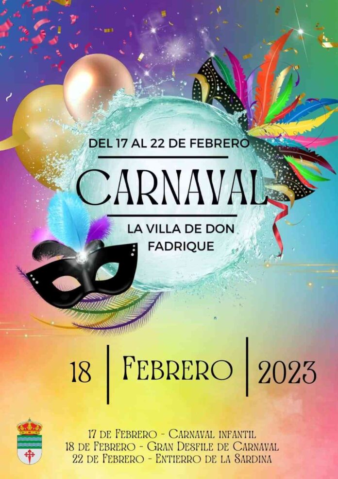 El Carnaval Infantil, que tendrá lugar el viernes, 17 de febrero de 2023, a partir de las cuatro de la tarde, dará el pistoletazo de salida a la programación carnavalesca de La Villa de don Fadrique (Toledo), que concluirá el miércoles, 22 de febrero, con el Entierro de la Sardina. El día grande será el sábado, 18 de febrero, con el Desfile Local Individual y de Comparsas para todas las edades, que concluirá, como siempre, en el Recinto Ferial, y que tendrá disponible más de 2.500 euros en premios. La principal novedad este año, será la «Semana Blanca Divertida», que tendrá lugar el lunes y martes, 20 y 21 de febrero, en el Centro de Usos Múltiples, para niños y niñas de 10:00 a 13:30 horas.