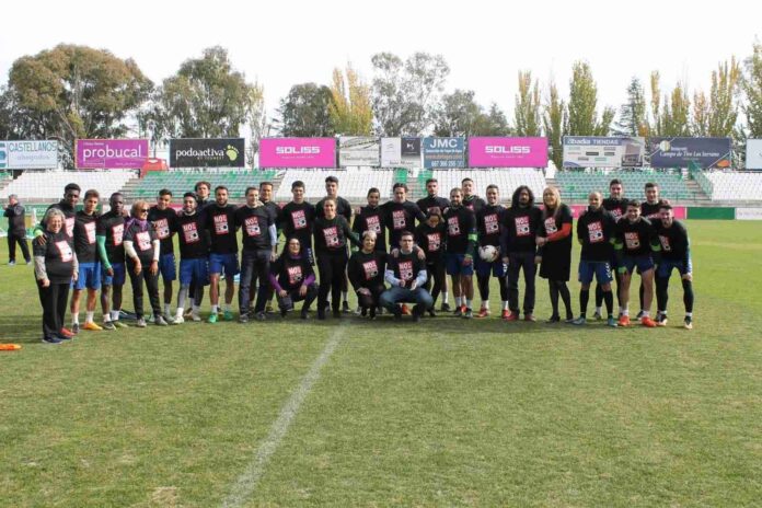 Junto a Inés Sandoval y a las integrantes del Consejo Local de la Mujer, el presidente del CD Toledo, Fernando Collado, jugadores y personal técnico del club, además del concejal de Juventud, Diego Mejías, y del portavoz del Grupo Municipal Ciudadanos, Esteban Paños, han posado para un vídeo y un reportaje gráfico con camisetas con el mensaje ‘No a la violencia contra las mujeres’ que el equipo toledano difundirá por redes sociales este sábado, 25 de noviembre.