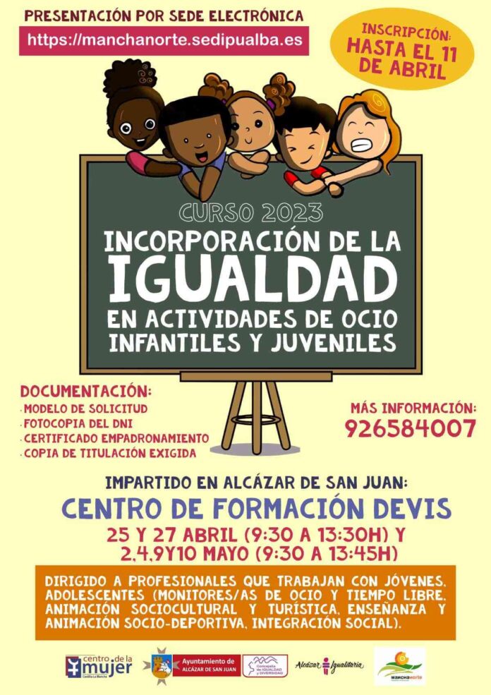 El Centro de la Mujer del Ayuntamiento de Alcázar de San Juan, junto con la Asociación Mancha Norte Desarrollo e Innovación, pone en marcha el curso “Incorporación de la Igualdad en Actividades de Ocio Infantiles y Juveniles” dirigido a profesionales que trabajan con jóvenes adolescentes, monitores/as de ocio y tiempo libre, animación sociocultural y turística, enseñanza, animación socio-deportiva e integración social.