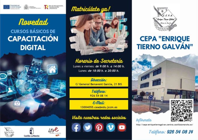 El Centro Público de Educación de Personas Adultas (CEPA) Enrique Tierno Galván abre su plazo de matriculación, contando como principal novedad con los nuevos cursos básicos de capacitación digital. Un centro que combina educación formal y no formal en su oferta educativa, convirtiéndose en la opción ideal para aquellos que quieran completar la Educación Secundaria Obligatoria o prepararse para las Pruebas de Acceso a la Universidad, así como para aquellos que desean adquirir otras competencias y enriquecerse de conocimiento de distintos ámbitos.