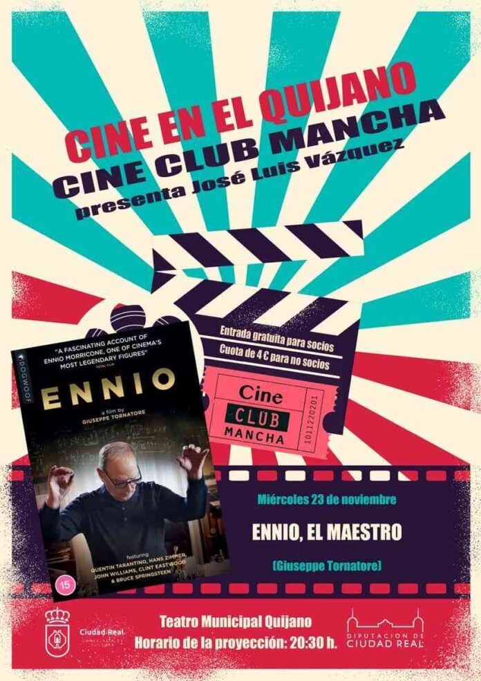 El pasado mes de octubre el Cine Club Mancha y el Ayuntamiento de Ciudad Real comenzaron una colaboración directa para potenciar la programación cultural de la ciudad, a través de proyecciones cinematográficas de excelente calidad. Prueba de ello es que este miércoles, 23 de noviembre, a las 20.30 horas, en el Teatro Municipal Quijano, se proyectará “Ennio: el maestro”, un sentido homenaje que otro gran creador, en este caso el cineasta Giuseppe Tornatore, dedicó el año pasado al grandísimo compositor italiano Ennio Morricone, autor de más de 500 bandas sonoras para películas y series.