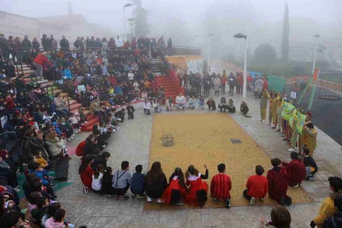 El alumnado del colegio San José ha celebrado esta mañana en el anfiteatro de la Plaza Poveda el día escolar de la Paz y la No violencia. En torno a la leyenda Japonesa de las mil grullas de origami, todas las etapas desde infantil a Formación Profesional han trabajado valores que en nuestro día a día pueden transformar el mundo.