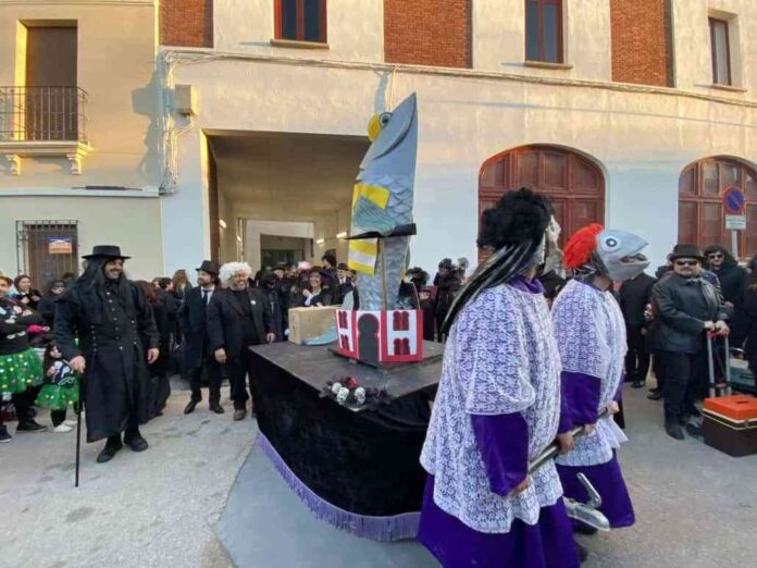 Como cada 28 de diciembre, Alcázar de San Juan despidió el Carnavalcázar con el Entierro de la Sardina y su incineración en la Plaza de Toros. Un día muy intenso el de ayer, que comenzó a las 12:00h en la Plaza de España con el Duelo a Doña Sardina, degustando pastas-sardina con mistela para sobrellevar el dolor por tan triste pérdida.